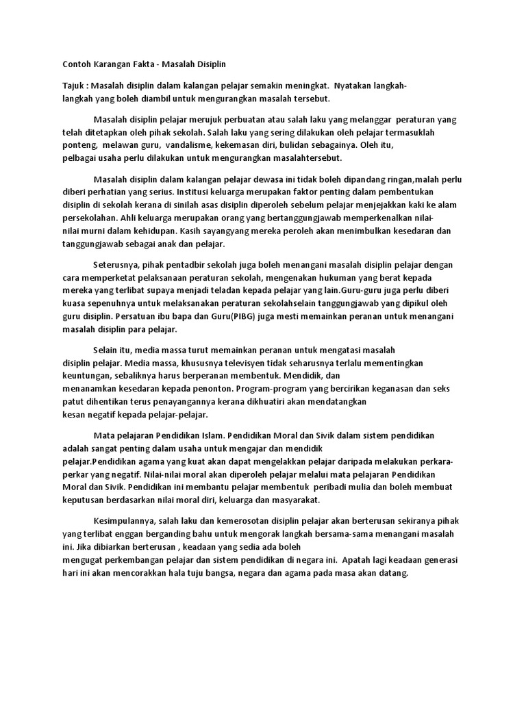 Karangan Masalah Disiplin Pelajar Dino Syukl from lh5.googleusercontent.com Masalah disiplin pelajar berdasarkan jantina di kolej komuniti hulu langat hanin falina mohd hashim1 siti nor lailiyah ibrahim2 kolej komuniti hulu langat kementerian pendidikan malaysia haninfalina.kkhl@gmail.com1 snlailiyah@gmail.com2 pengenalan pelajar merupakan elemen atau aset penting dalam negara dan bakal menjadi pemimpin negara pada masa hadapan. Membuli penyalahgengsterisme gunaan dadah contoh masalah disiplin berjudi ponteng melepak 3. Amalan kerohanian membentuk disiplin pelajar 29 oleh yang demikian, penghayatan agama merupakan satu unsur yang sangat penting dalam mempengaruhi kualiti peribadi seseorang pelajar muslim dalam usaha melahirkan pelajar yang cemerlang sahsiah atau peribadi dan seimbang dari segi jasmani, rohani, mental dan emosi. Walau bagaimanapun, masalah disiplin di kalangan pelajar sekolah menegah lebih serius berbanding dengan pelajar di sekolah rendah. Misalnya, teori pembelajaran sosial oleh bandura (1977) yang menegaskan tingkah laku individu dipengaruhi oleh persekitaran. Salah laku yang sering dilakukan oleh murid termasuklah ponteng, melawan guru, vandalisme, kekemasan diri, buli dan sebagainya. Menurut sumber masalah ponteng sekolah merupakan kesalahan disiplin paling tinggi yang mencatatkan sebanyak 1 4 iaitu bersamaan 67 053 orang pelajar pada tahun 2017. Seramai 313 orang pelajar yang terlibat dalam masalah disiplin dari daerah kuala terengganu terlibat dalam kajian ini.