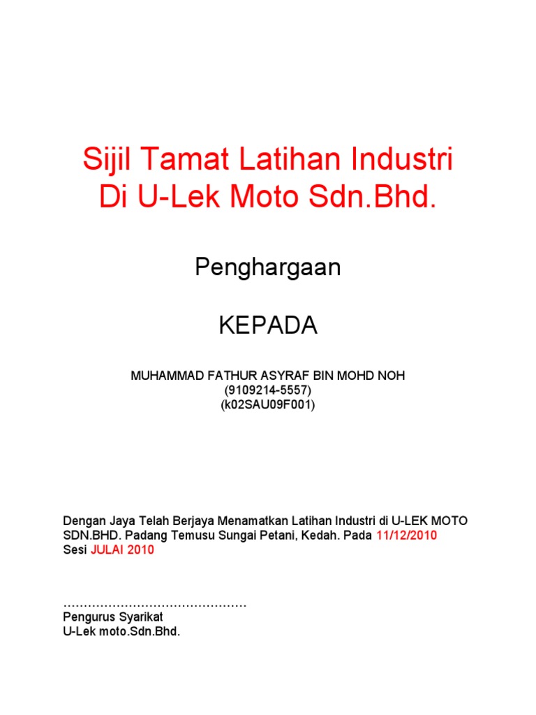 Penempatan pelajar bagi menjalani program ini dikehendaki melaporkan diri di Sijil tamat latihan industri di u. Elektronik dan aplikasi teknologi maklumat dan komunikasi. 23 3.1 ringkasan tentang aktiviti kerja yang dilakukan sepanjang menjalani latihan industri. Perbadanan kemajuan negeri selangor (pkns) bahagian sumber manusia.